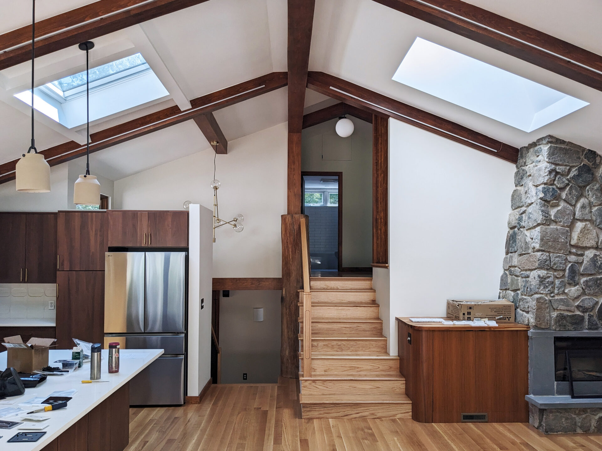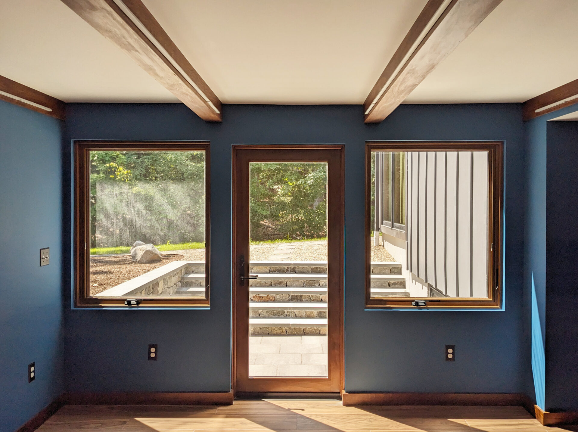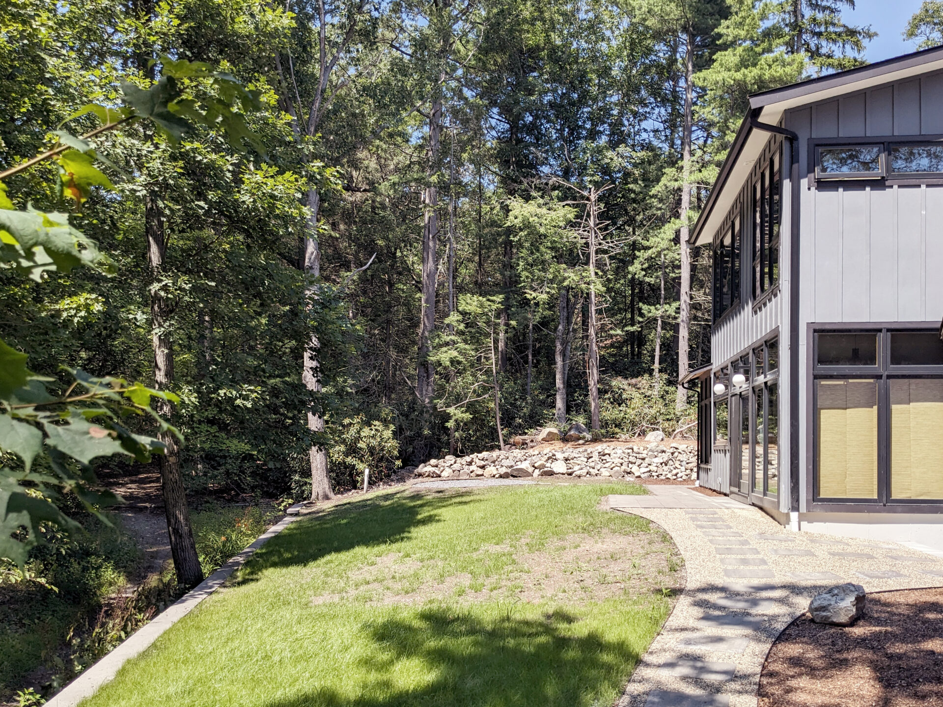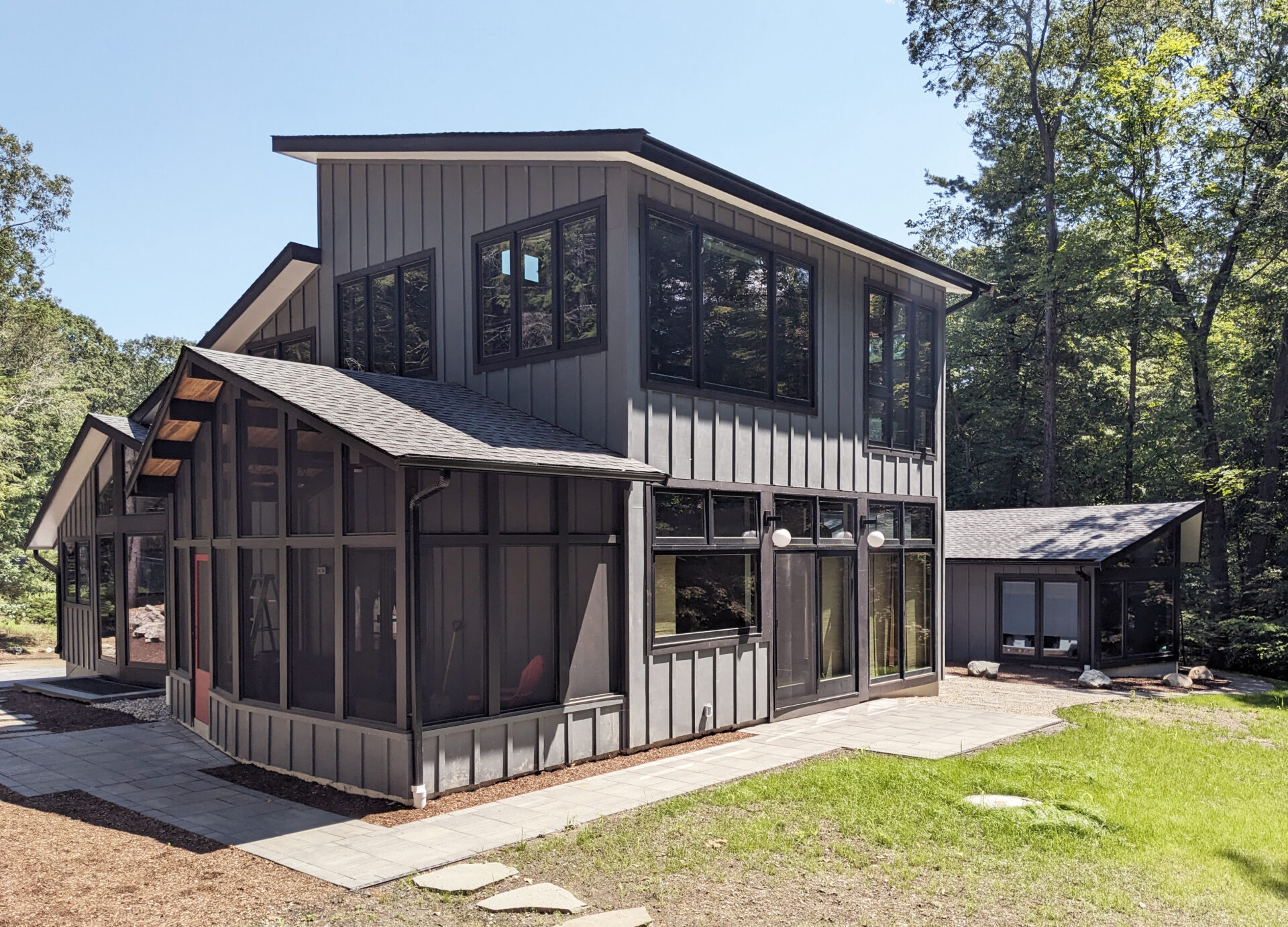 Cozied up against the eastern edge of the Middlesex Fells Reservation, this Stoneham residence takes full advantage of the peaceful setting and plentiful forest views. The original house was designed and built in the Mid-Century Modern style by its occupant, a prominent local architect. The renovation largely preserves the character of the house as seen from the street, with its horizontal massing and low, deep eaves. To the rear, two additions create a new guest suite as well as an enlarged living room and a modern master bedroom suite. These additions include large windows to take full advantage of the forest setting, while leaving room for an outdoor patio. The project was completed in 2025.