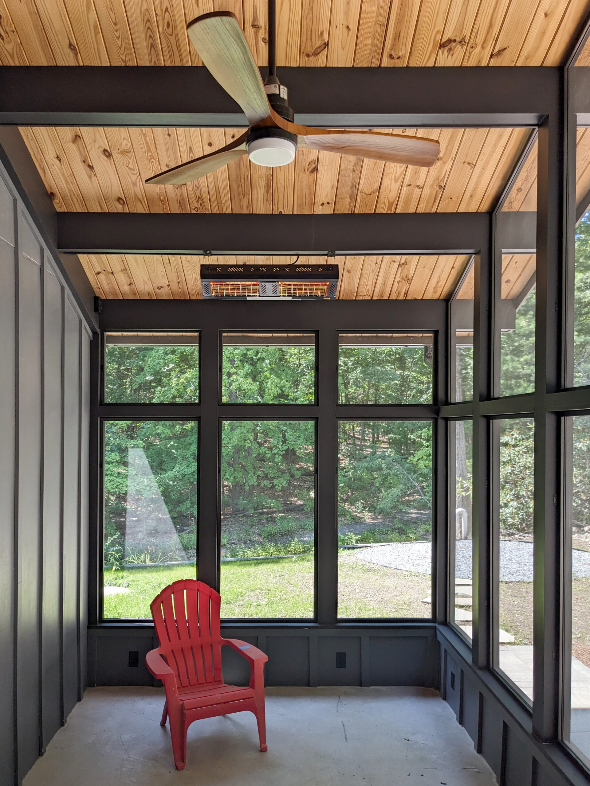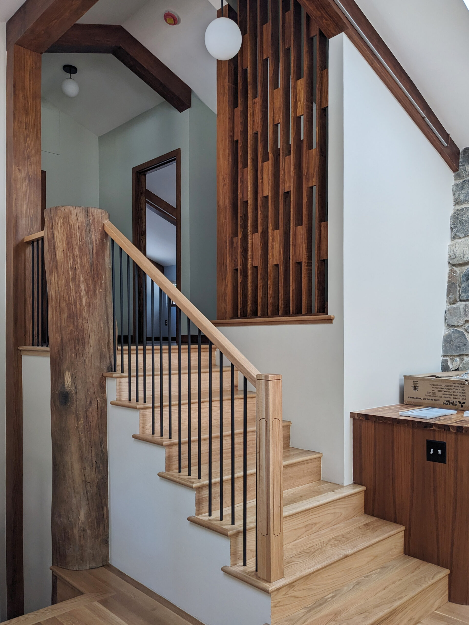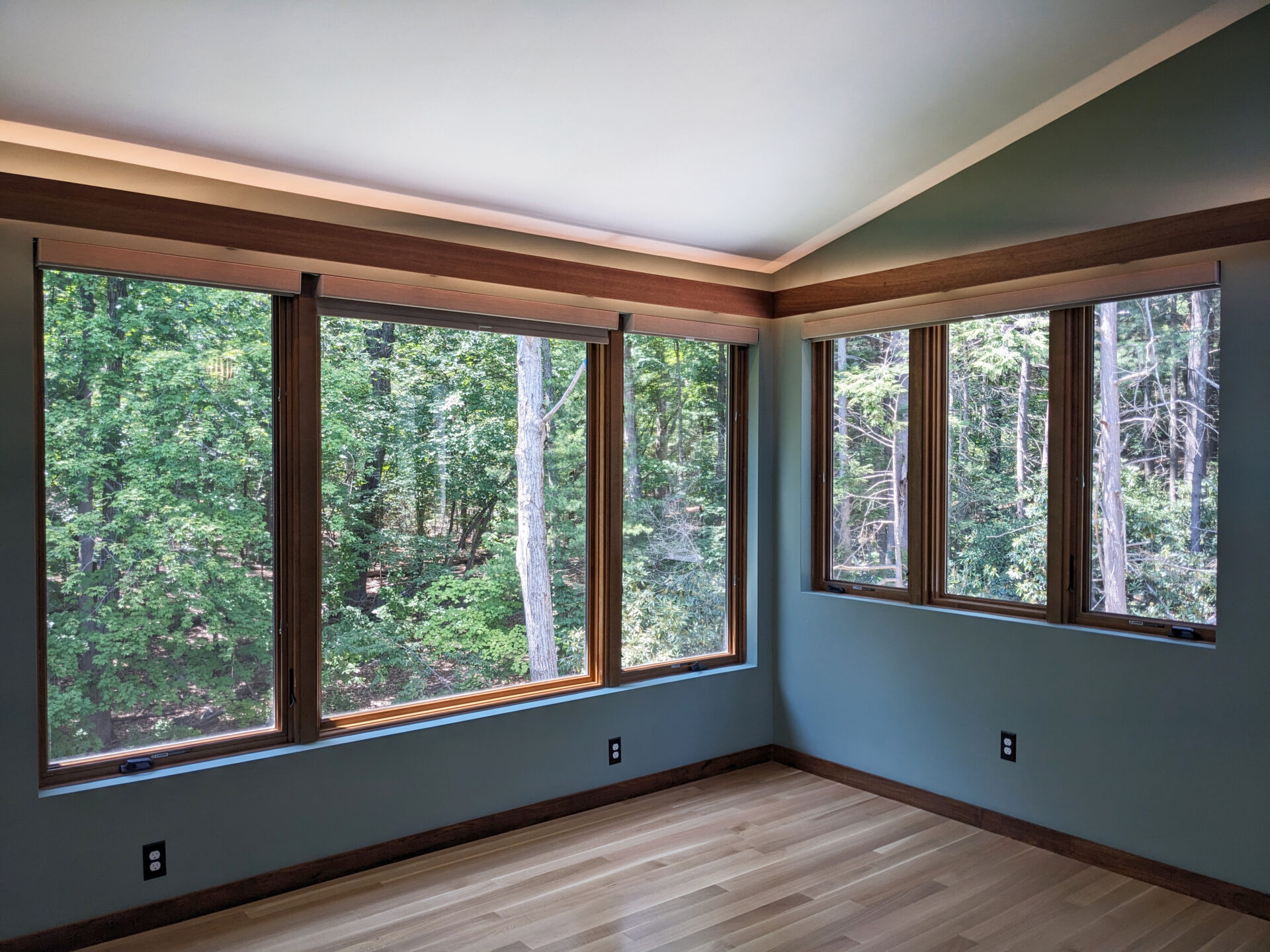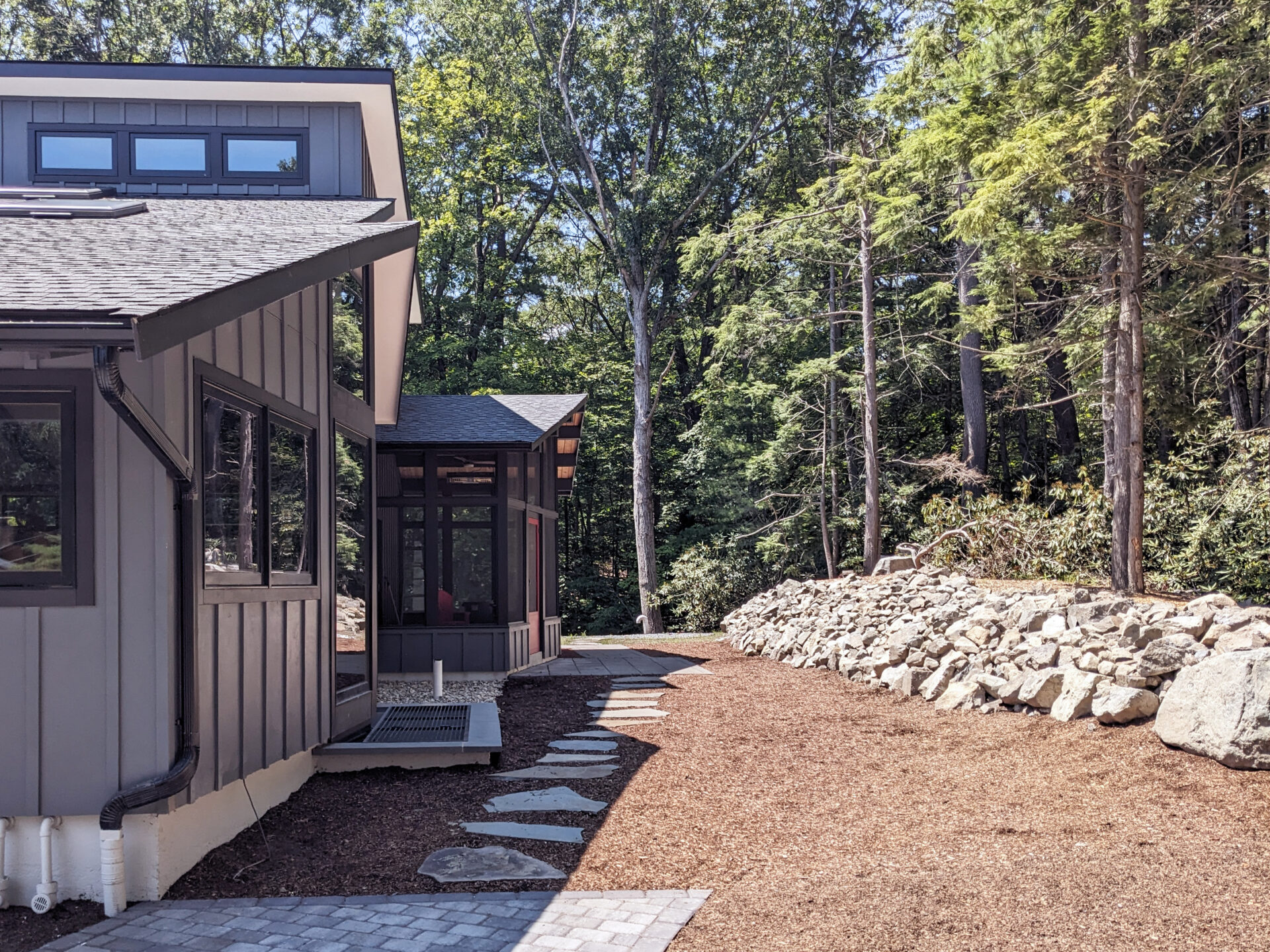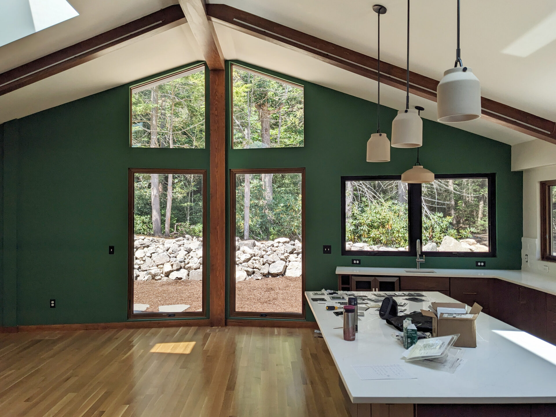 Cozied up against the eastern edge of the Middlesex Fells Reservation, this Stoneham residence takes full advantage of the peaceful setting and plentiful forest views. The original house was designed and built in the Mid-Century Modern style by its occupant, a prominent local architect. The renovation largely preserves the character of the house as seen from the street, with its horizontal massing and low, deep eaves. To the rear, two additions create a new guest suite as well as an enlarged living room and a modern master bedroom suite. These additions include large windows to take full advantage of the forest setting, while leaving room for an outdoor patio. The project was completed in 2025.