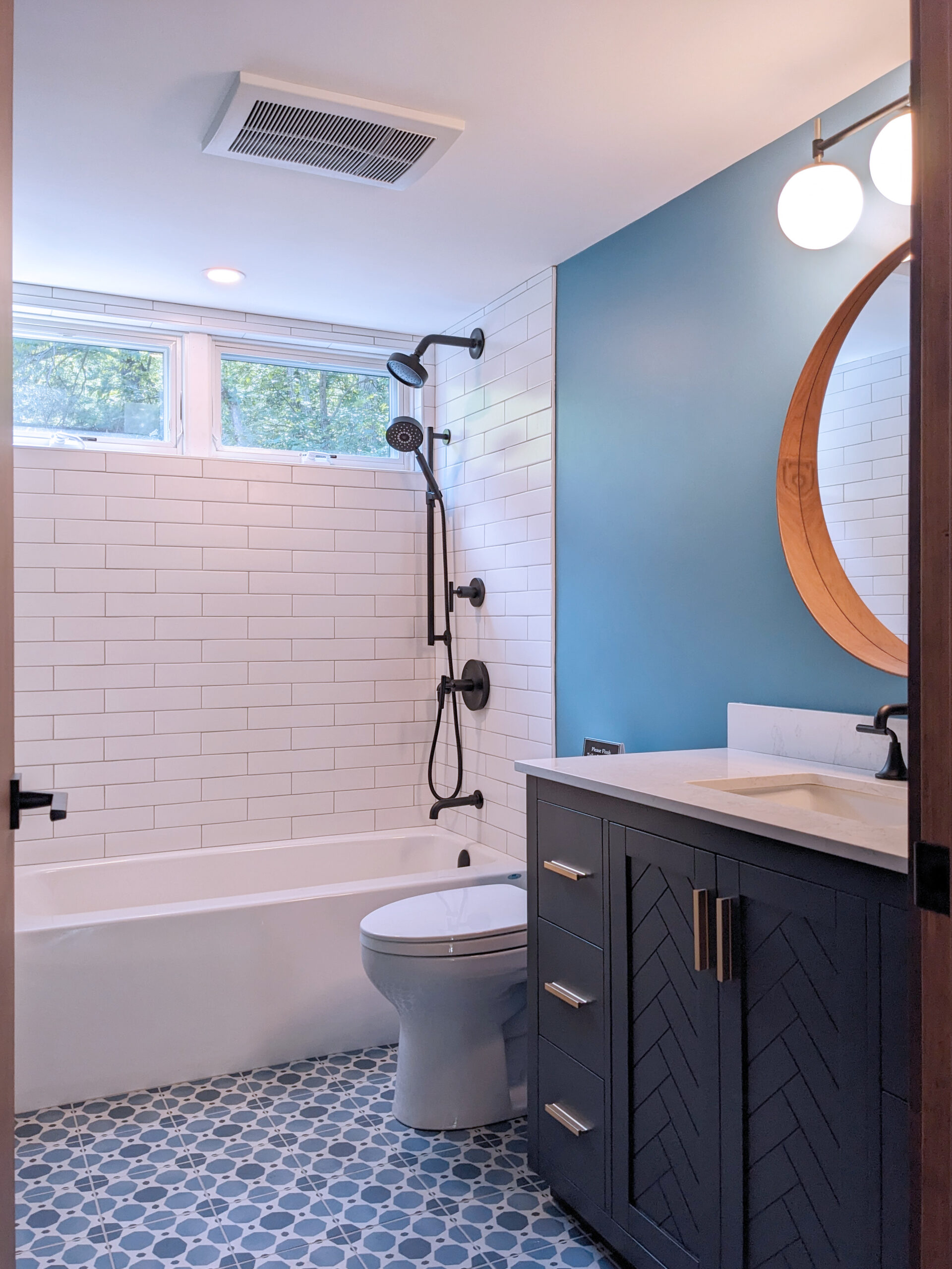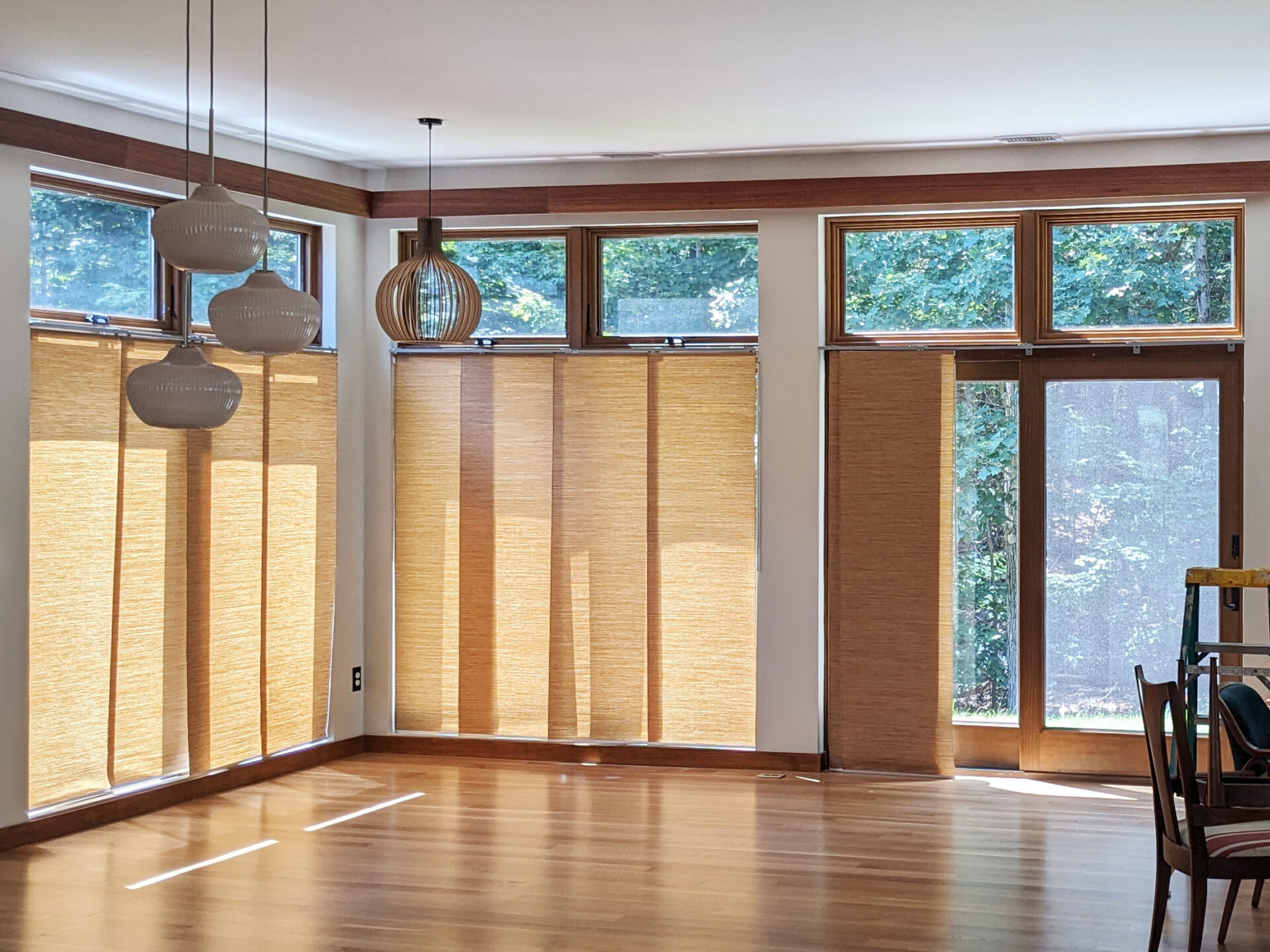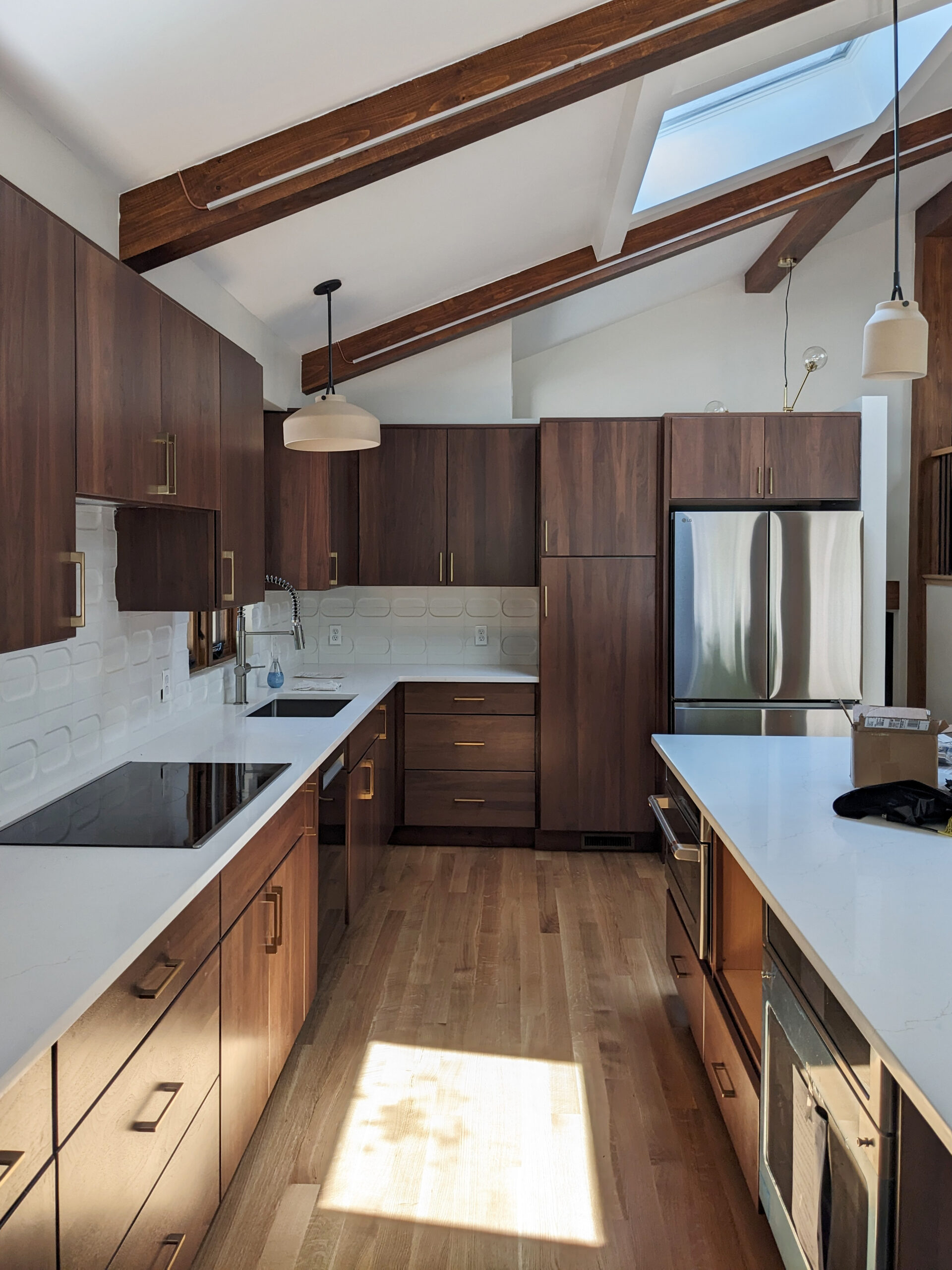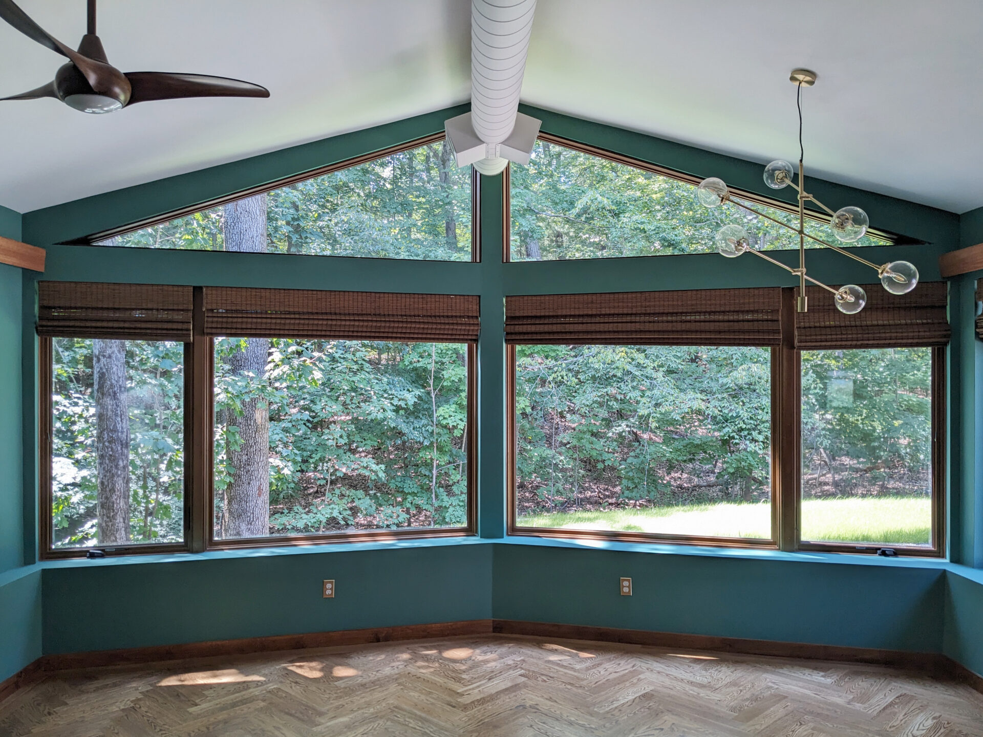 Cozied up against the eastern edge of the Middlesex Fells Reservation, this Stoneham residence takes full advantage of the peaceful setting and plentiful forest views. The original house was designed and built in the Mid-Century Modern style by its occupant, a prominent local architect. The renovation largely preserves the character of the house as seen from the street, with its horizontal massing and low, deep eaves. To the rear, two additions create a new guest suite as well as an enlarged living room and a modern master bedroom suite. These additions include large windows to take full advantage of the forest setting, while leaving room for an outdoor patio. The project was completed in 2025.